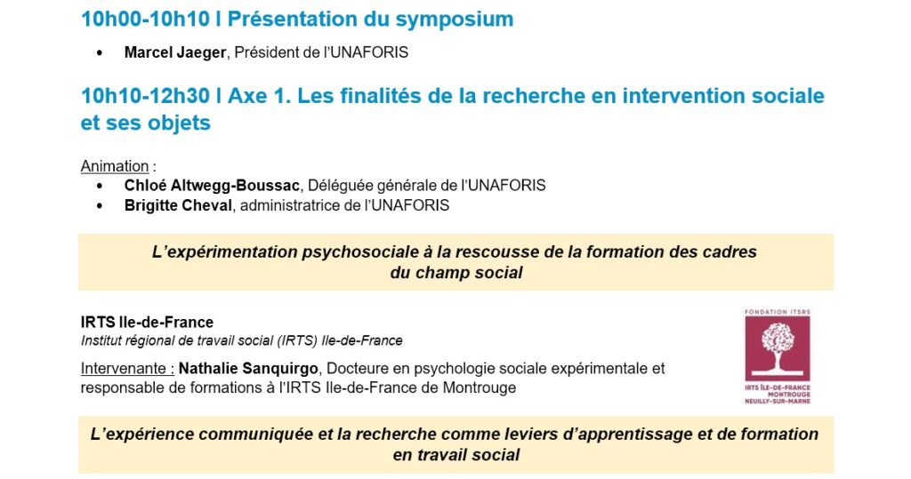 - 1er axe, le matin : les finalités de la recherche en intervention sociale et ses objets, dont au moins trois :