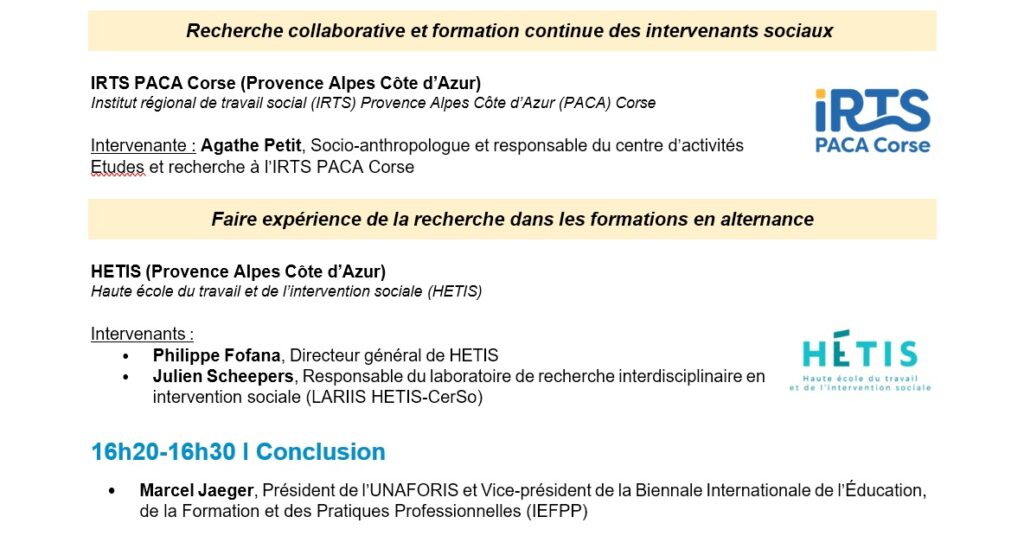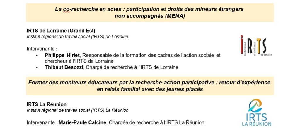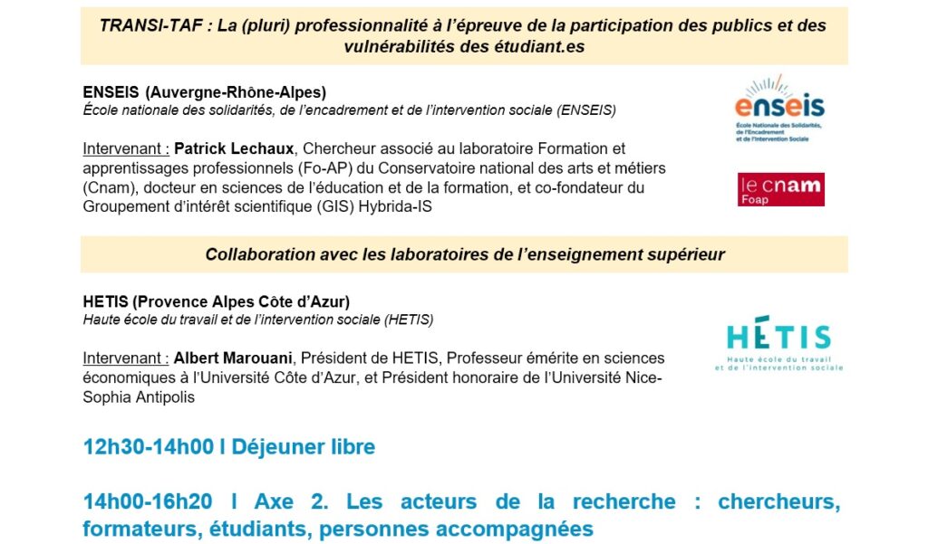 - 2e axe, l’après-midi : les acteurs de la recherche : chercheurs, formateurs, étudiants, personnes accompagnées (par exemple en associant ATD Quart Monde)